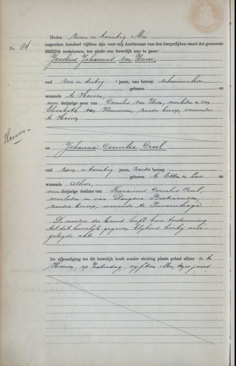 | -Aangifte geboorte | vr 2 dec 1887; Brabants Historisch Informatie Centrum, Toegang 50.055, Akte 170 | | -Overlijden | http://www.vanunen-stamboom.nl |