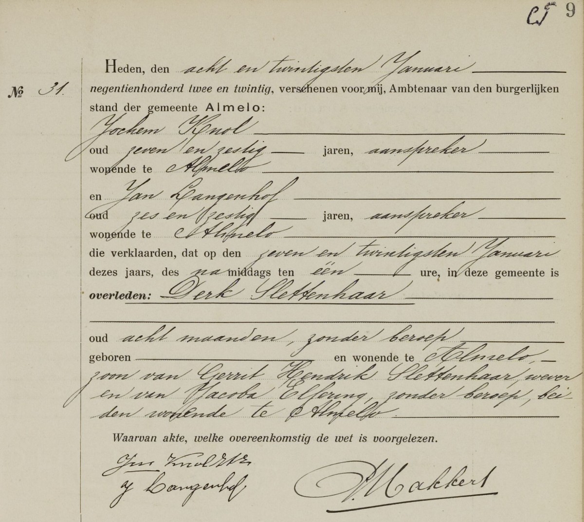 za 28 jan 1922; Archief Almelo, Akte 31