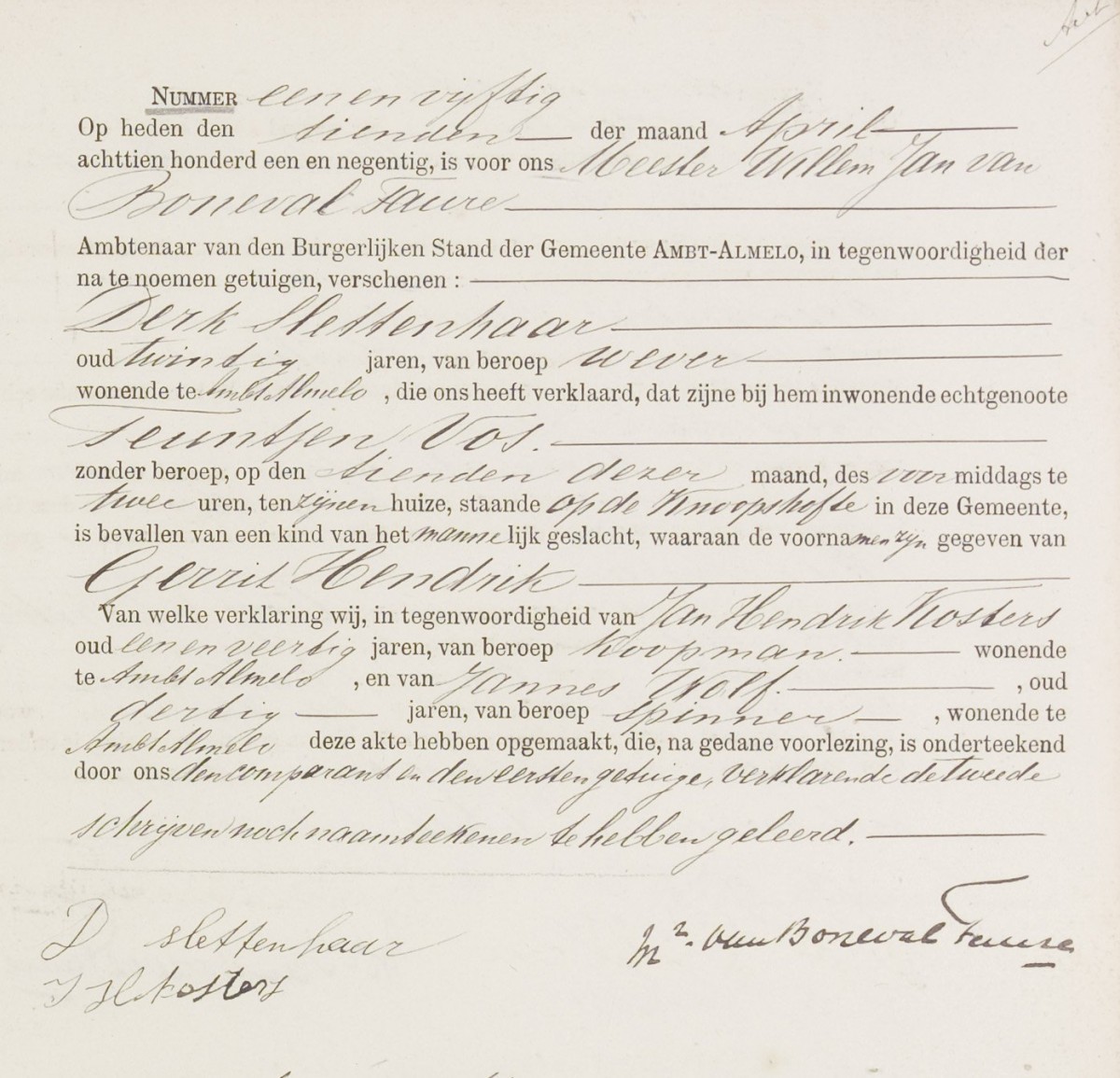 | -Aangifte geboorte | vr 10 apr 1891; Archief Almelo, Akte 51 | | -Overlijden | Henk Slettenhaar |